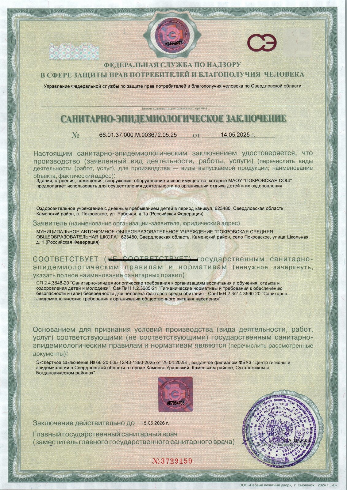 Санитарно-эпидемиологическое заключение СМОТРЕТЬ